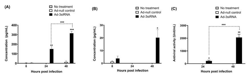 (A)猪IFN-α蛋白水平、(B)IFN-β蛋白的水平、(C)使用Ad 3siRNA感染的猪细胞的上清液测量抗FMDV活性
