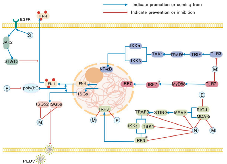 图1:结构蛋白在PEDV逃逸宿主先天免疫中的作用。具体而言,这些结构蛋白抑制JAK2/STAT3、NF-κB和IRF等关键节点,干扰TLR3、TLR7和RIG-I/MDA-5等PRR,并拮抗IFN刺激因子。它们不仅能对宿主先天免疫反应产生拮抗作用,还能通过这种拮抗作用协助病毒逃逸宿主先天免疫防御。EGFR:表皮生长因子受体;poly(I:C):聚肌苷酸-聚胞苷酸;JAK2:Janus激酶2;STAT3:信号转导与转录激活因子3;TLR3:Toll样受体3;MAVS:线粒体抗病毒信号蛋白;IKKα:IκB激酶α;IKKε:核因子κB抑制因子ε激酶;STING:干扰素基因刺激物。该图由BioGDP.com创建。