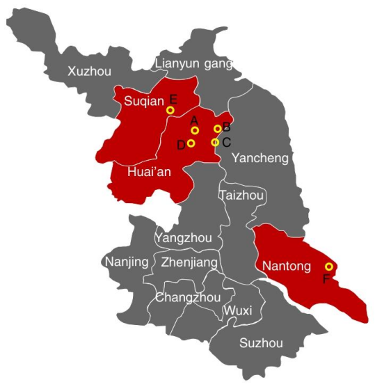 图1江苏省地图及样本来源地。红色区域:中国江苏省内共计采集1840份样本的城市。A、B、C、E、F点:来自淮安的样本采集点(5个养猪场);D点:来自(淮安某)屠宰场的100份扁桃体样本。