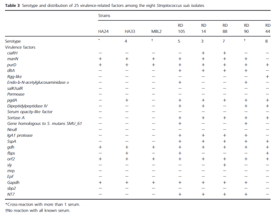 研究团队检测了25个毒力相关基因,发现所有分离株均携带manN、purD、orf2和gdh等保守基因,而未检测到salK/salR、通透酶、血清不透明样因子、neuB、mrp、epf或sbp2基因,约半数菌株携带dltA、pgdA、srtA和sspA基因,只有菌株RD88携带sly基因,除RD44外,几乎所有分离株都发现了gapdh和NT7基因。基因型epf-/mrp-/sly-最为普遍,存在于7个分离株中,其次是epf-/mrp-/sly+,存在于1个分离株中。南通地区的菌株携带的毒力相关基因数量明显多于淮安地区,同时存在sortaseA、pgdA、sspA、二肽基肽酶IV和IgA1蛋白酶;特别是菌株RD105拥有最多数量的毒力相关基因(15/25)。