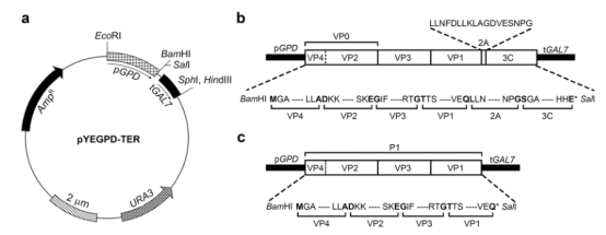 (a)酵母游离型表达载体pYEGPD-TER图谱。(b)pYEGPD-P1-2A-3C构建体中P1/2A和2A/3C连接处的氨基酸序列。(c)pYEGPD-P1构建体(对照)中P1的氨基酸序列。