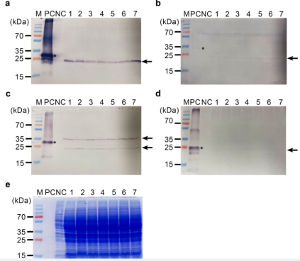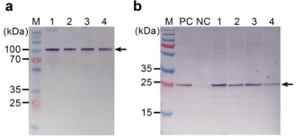 上样前样品(a)未煮沸和(b)煮沸处理。未煮沸时,抗体识别到大于100 kDa的未成熟原聚体;煮沸后,则识别到解离的衣壳亚基(约24 kDa)。这表明酵母表达的蛋白已组装成对热敏感的VLPs结构。