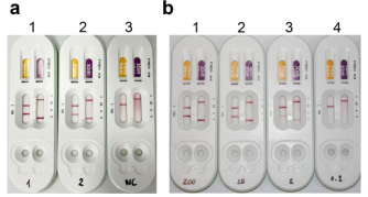(a)转化子总蛋白(1)和部分纯化的VLPs(2)检测为阳性(左二带为FMDV阳性,右二带为O型特异性)。(b)系列稀释显示,低至20µg的酵母总蛋白仍可被检测到。