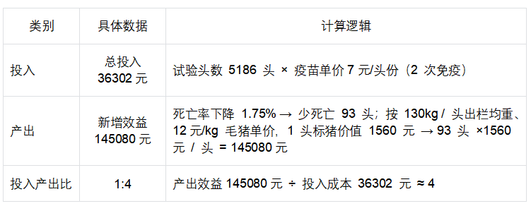 结论:华派链传胸康灭活疫苗在试验中安全性良好、免疫效果显著,可降低死淘率、提升生产性能,且投入产出比达1:4,是仔猪断奶后经济可行的降本措施,推广价值高。